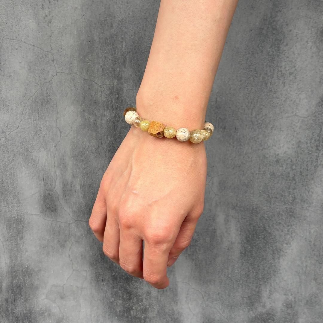 肌馴染みのいい配色なのでどんなコーディネイトにも馴染む万能なブレスです。金色の石は金運を上げてくれるため金運アップはもちろん、金運が上がるということはその手前に仕事運や運気自体の上昇も含まれます。