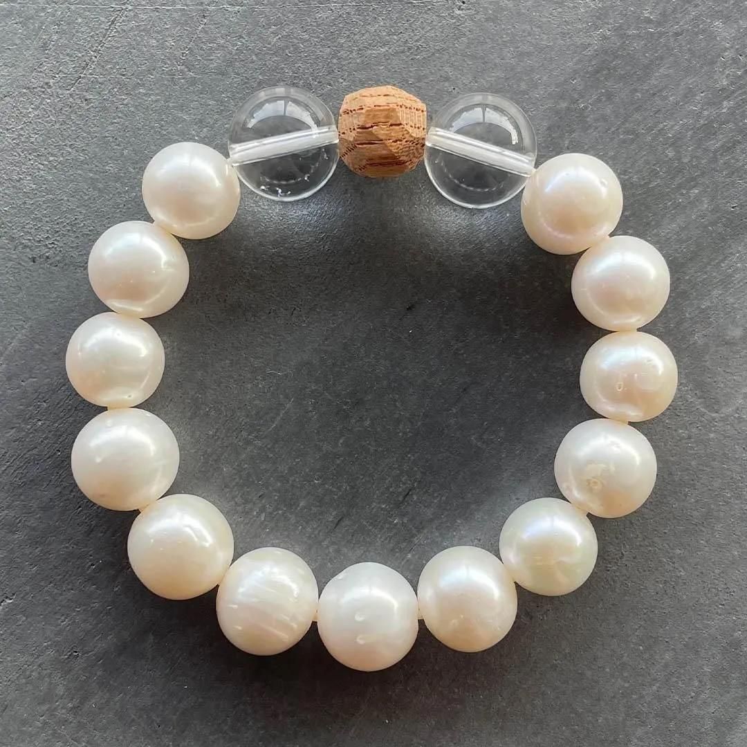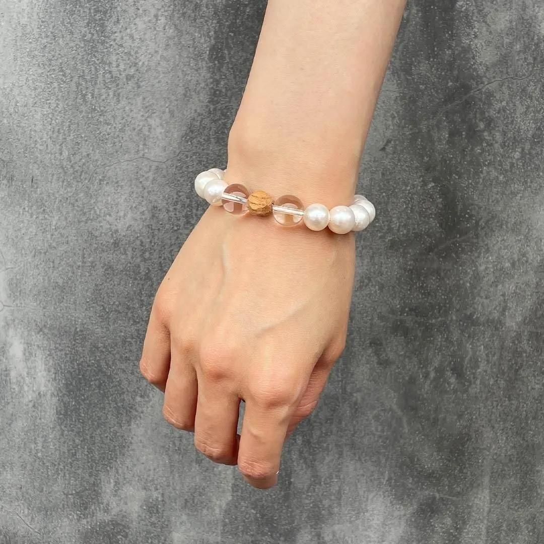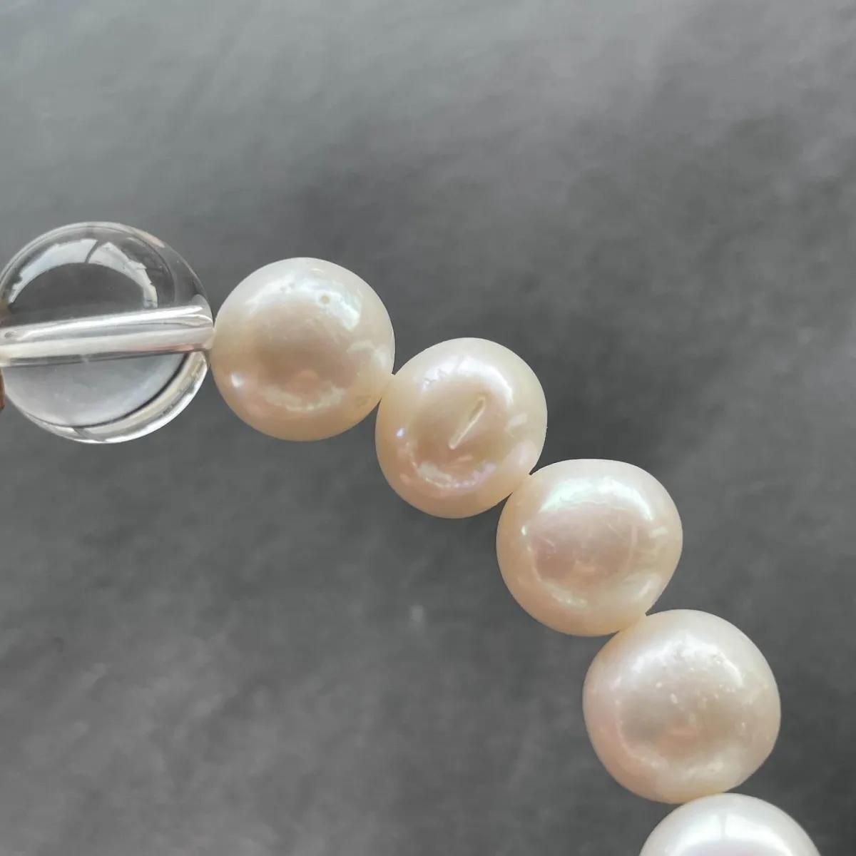 Plump and large freshwater pearl bracelet. The large freshwater pearls with a circumference of 10.5 to 11.5 mm are not perfectly round, but are slightly distorted and have some dimples, but this is a characteristic of organic matter. (As shown in the image) Combine with crystal to create a slightly Japanese treasure-like finish.