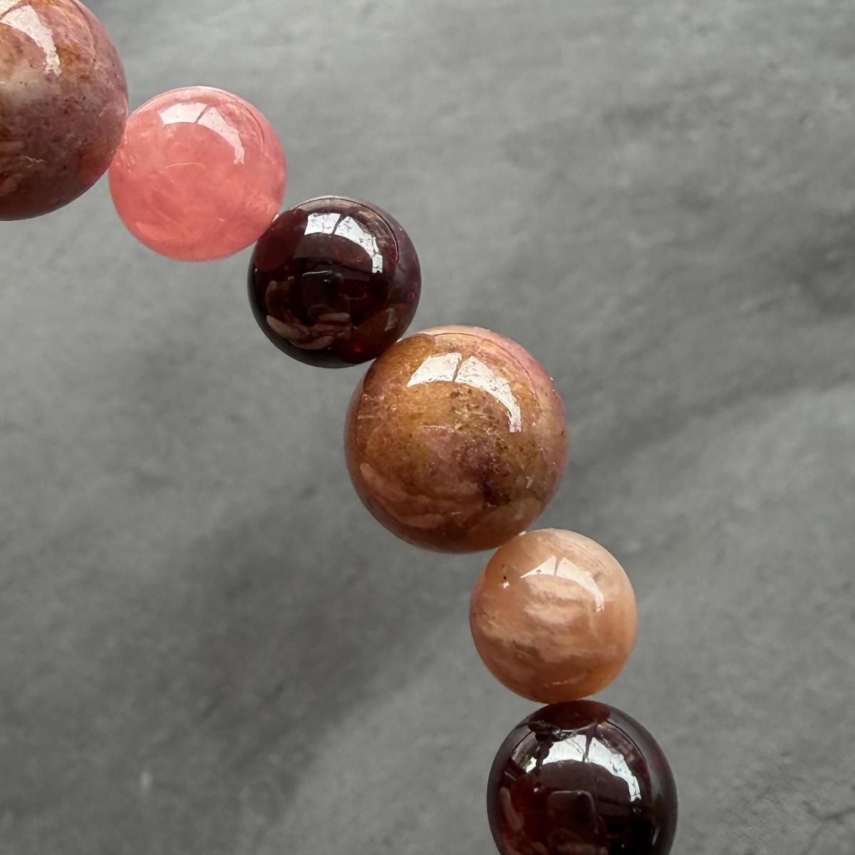 日本産の鉱石は黒・茶・グレーの暗めな石や白濁ベースが多い中、ロードナイトは茶色〜オレンジみも含みつつ、まろやかなピンク。