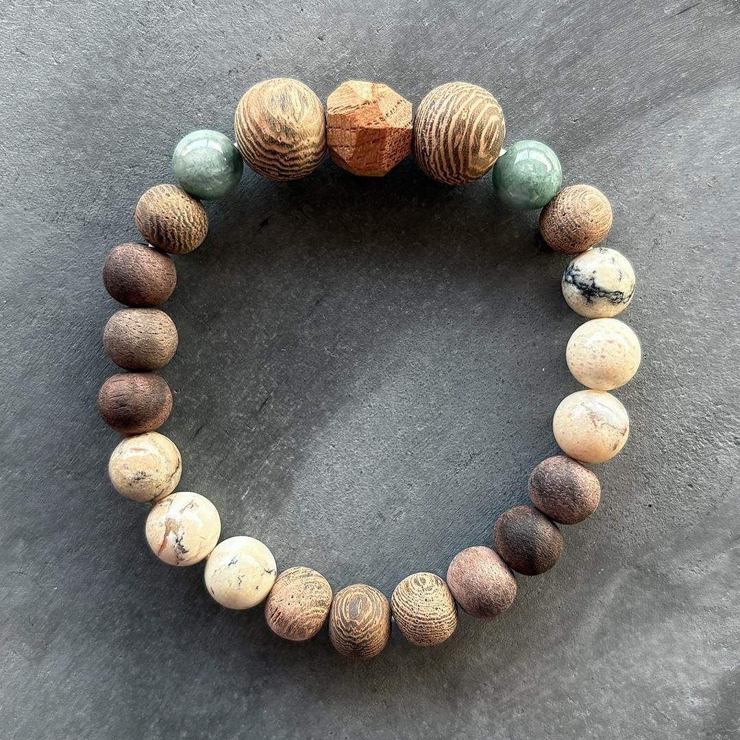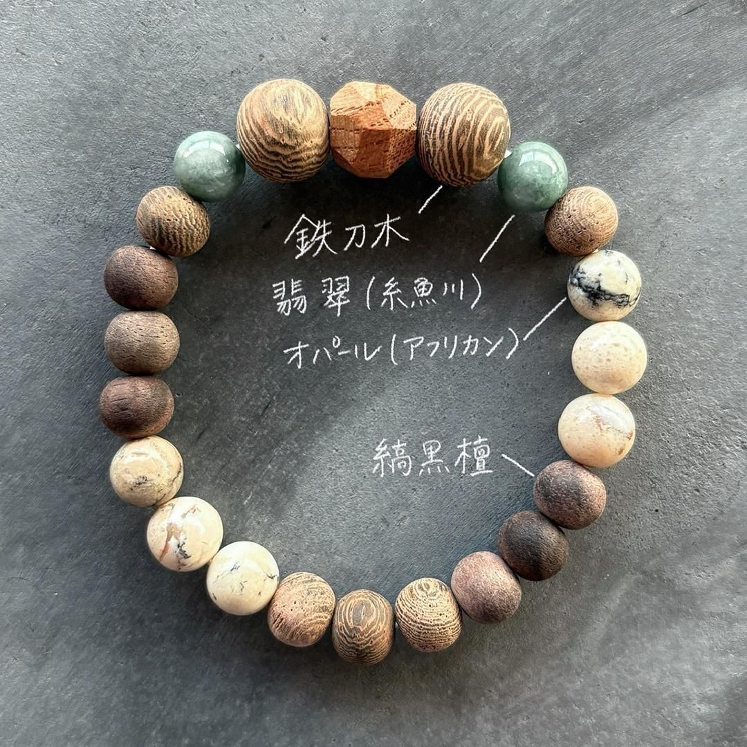 少しポジティブ要素を取り入れたいので、前向きな思考へ向け、大らかさをくれるアフリカンオパール、着実な成長や実りを象徴する鉄刀木(たがやさん)、直感力を高める翡翠の中からは特に希少な糸魚川翡翠を。