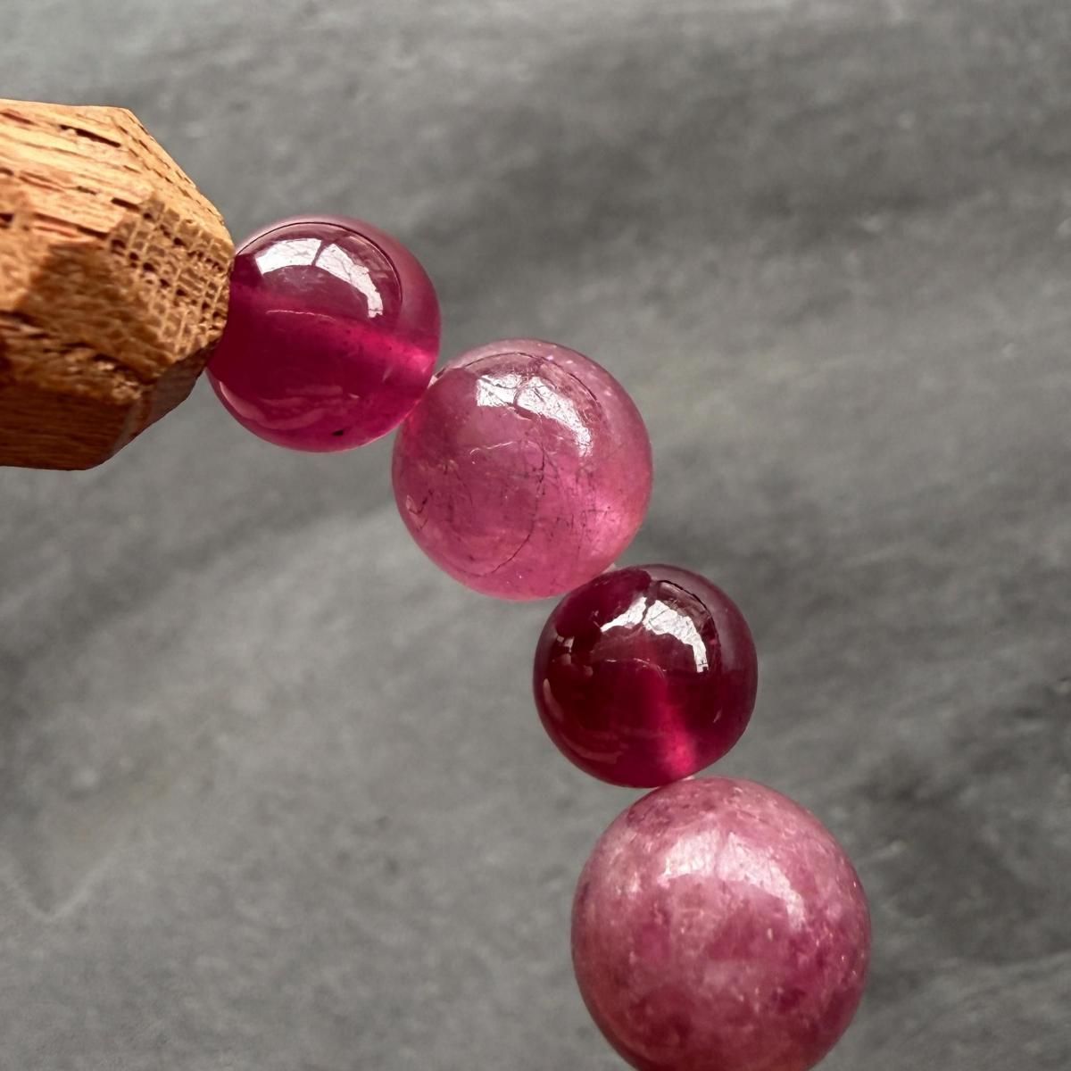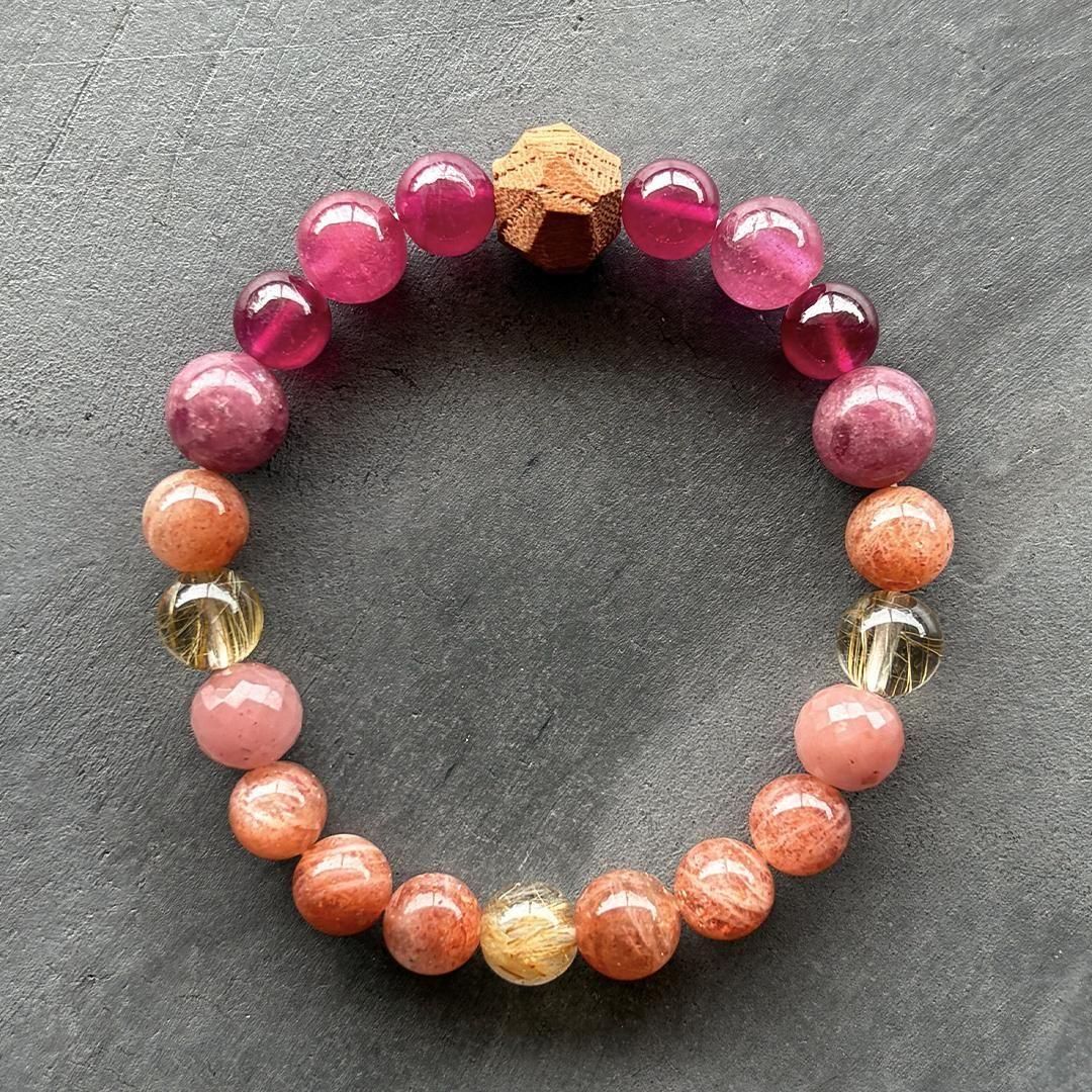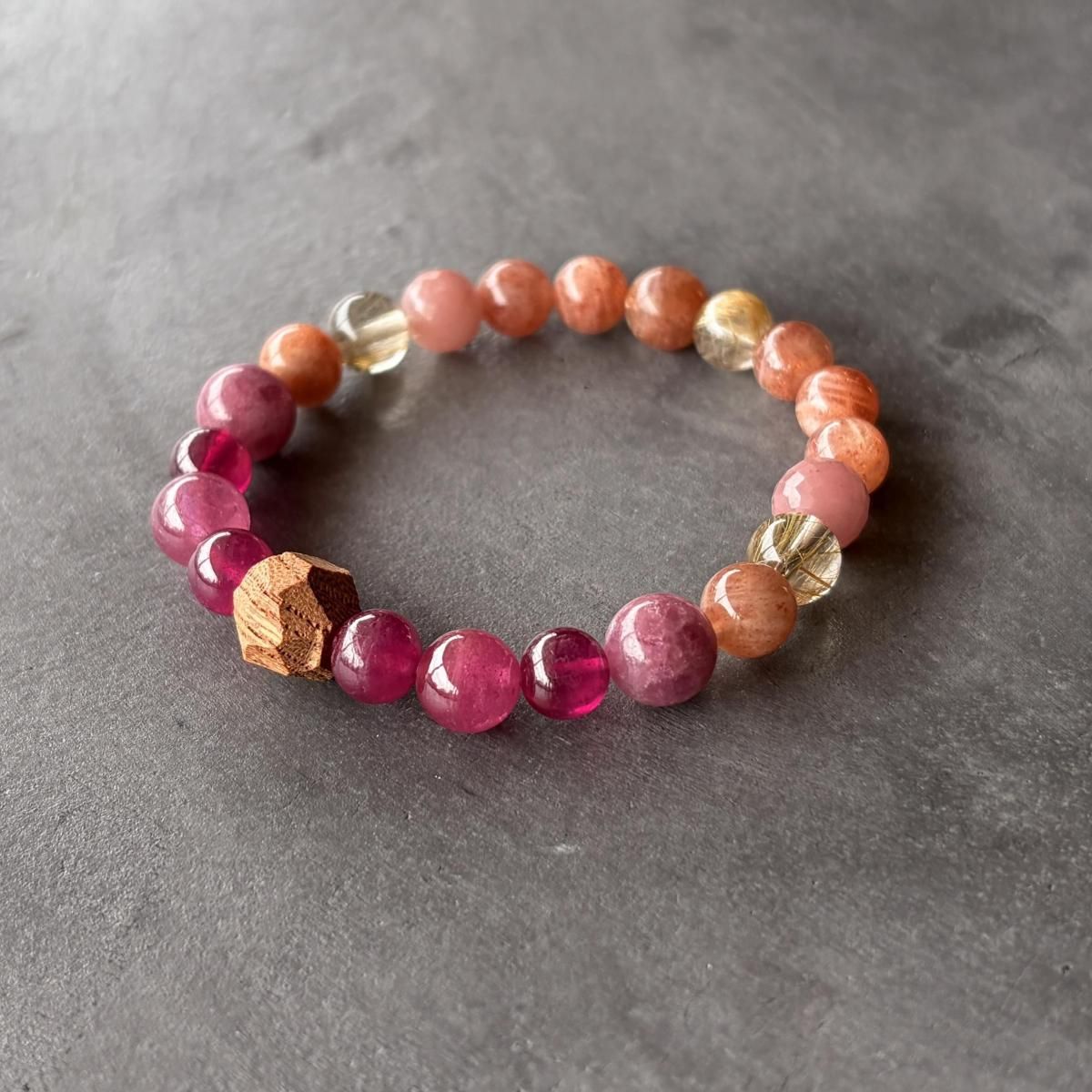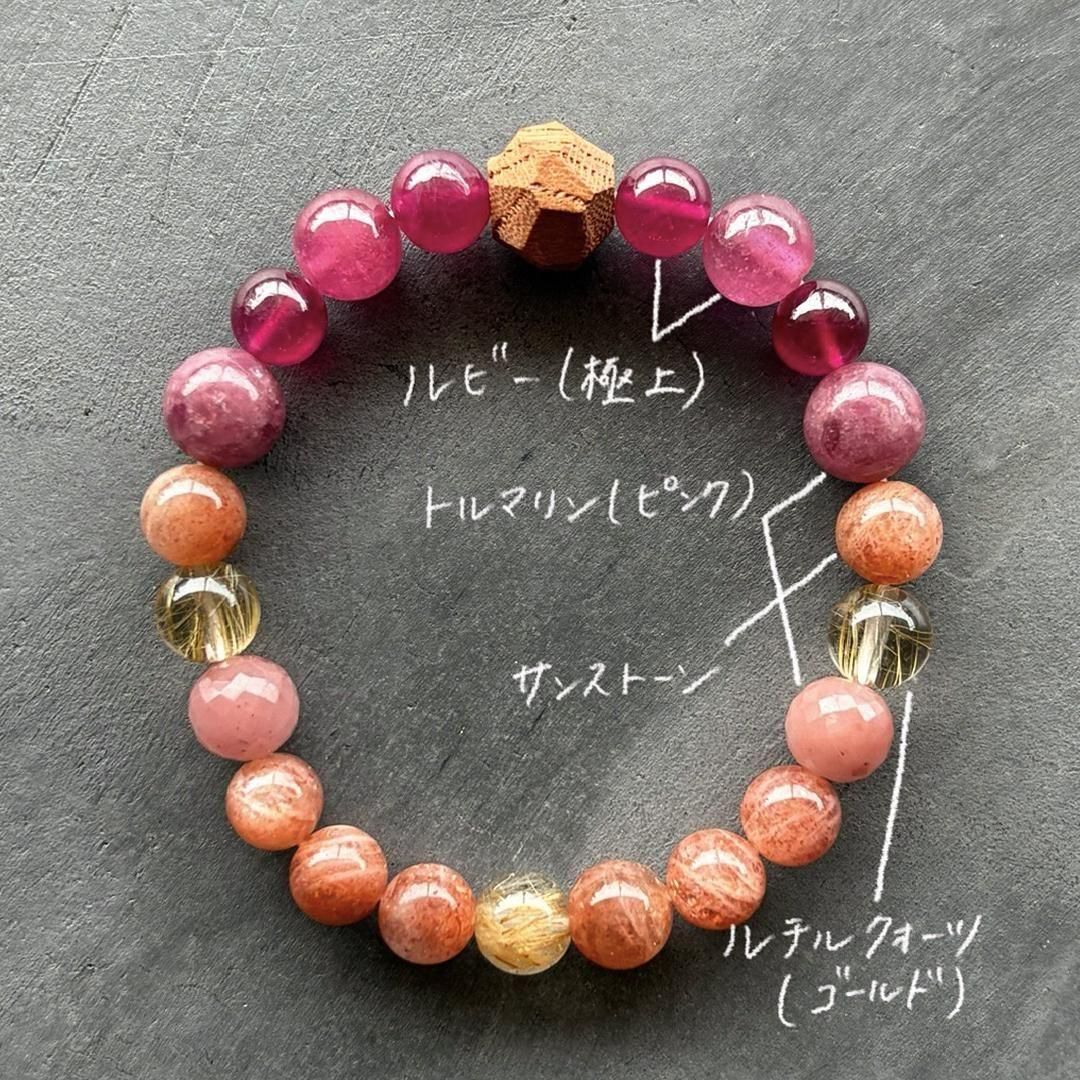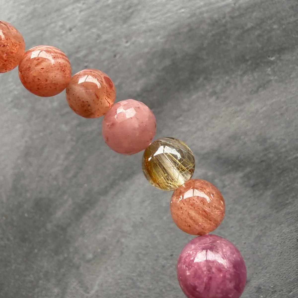 深く濃いピンクとフューシャピンク、2トーンのルビーと、カットと色の異なる2種のピンクトルマリンが連なり、徐々に柔らかなオレンジピンクのサンストーンとルチルの面に切り替わります。