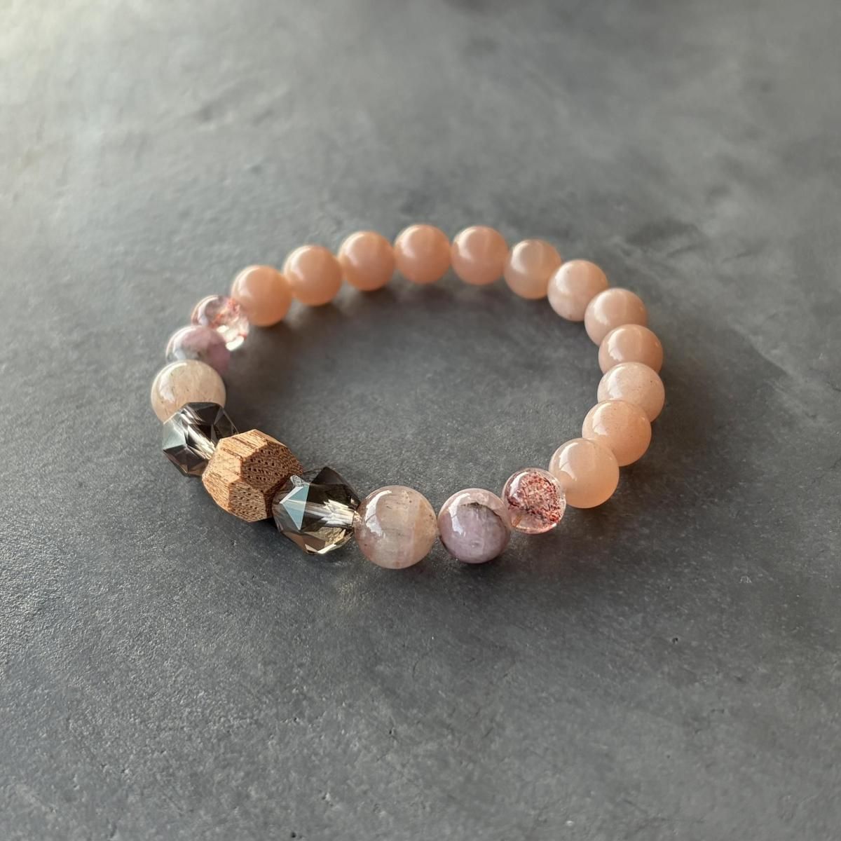 柔らかくも赤みを含むオレンジピンクのムーンストーンを使った1本です。